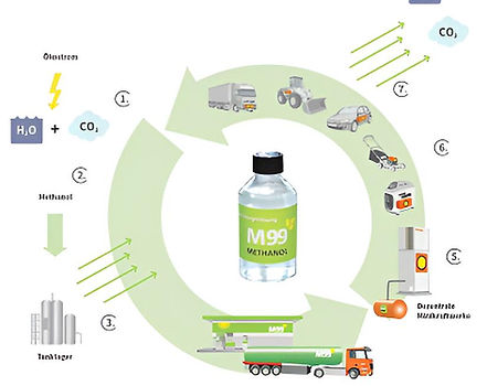 Methanol kann zentral in Großkraftwerken oder dezentral in Kleinanlagen hergestellt werden genau dort, wo Ökostrom günstig erzeugt wird und nicht sofort benötigt wird. Bei der Nutzung wird Methanol wieder in seine ungiftigen Bestandteile COâ‚‚ und Wasser zerlegt und an die Umwelt zurückgegeben.